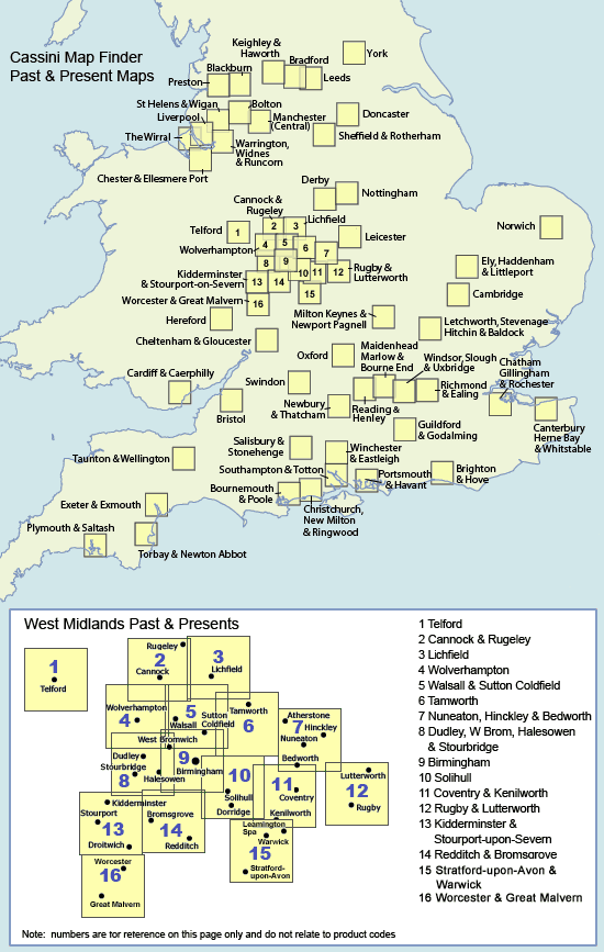 Each Past & Present map is centred on a city or town and covers an area of 15km x 15km using four Ordnance Survey mapping series to cover four different periods: the mid 19th century, the late 19th century, the1920s and the present-day. All four maps cover exactly the same area. To achieve this, the three historical maps have been enlarged from their original inch-to-the-mile to match the 1:50,000 scale of the present-day one. The addition of the familiar National Grid on all four maps enables easy comparison across the four time periods. Historical notes, details of the original maps used and web-links for local history societies and other sources of information are also provided. All in all, comparing the past with the present has never been easier!